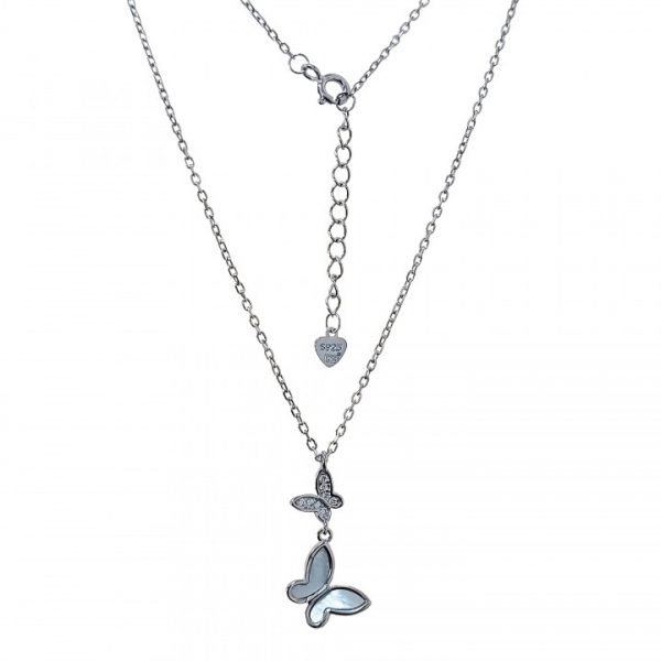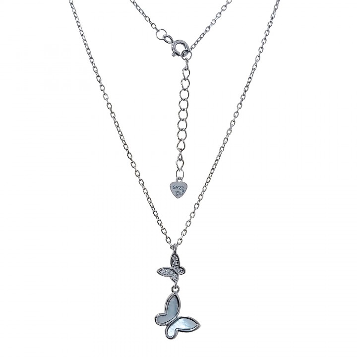 Gargantilla de plata con dos mariposas. Esta moderna gargantilla presenta una mariposa de circonitas blancas y otra de nácar, añadiendo un toque de encanto y elegancia a tu look. Un símbolo de transformación y belleza, esta gargantilla realzará tu estilo con un toque de sofisticación y frescura