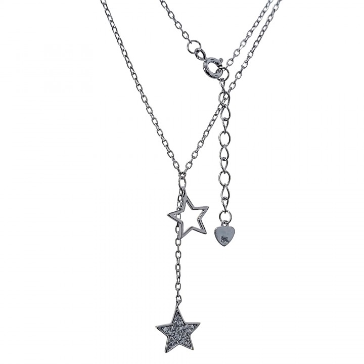 Gargantilla de plata con dos estrellas. Una lisa y la otra deslumbrante con circonitas blancas. Un contraste estelar que ilumina tu estilo con un toque de brillo y elegancia.