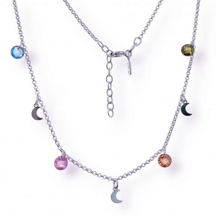 Gargantilla de plata con cadena de 42cm+ 3cm adaptables con motivo de estrella o lunas. Adornada con circonitas de colores que brillan como pequeños planetas, es un recordatorio de que puedes llevar la magia del universo cerca de tu corazón en todo momento.