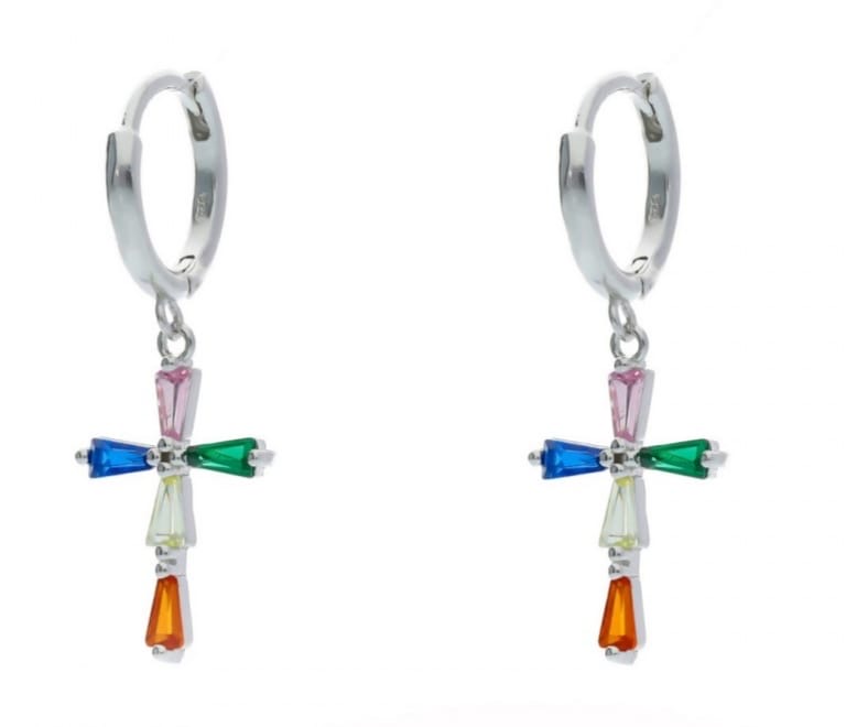 Pendientes de aros con forma de cruz y piedras de colores.