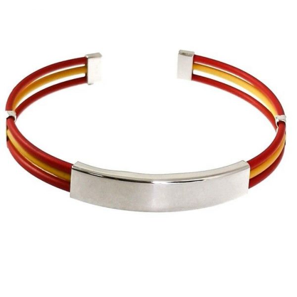 Refleja tu estilo distintivo con esta pulsera de plata para hombre, decorada con cuerdas en los colores de la bandera de españa. Con un cierre adaptable, esta pulsera se ajusta a la perfección. Añade un toque de originalidad y elegancia a tu look diario con este accesorio único y moderno.